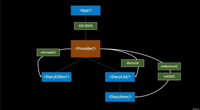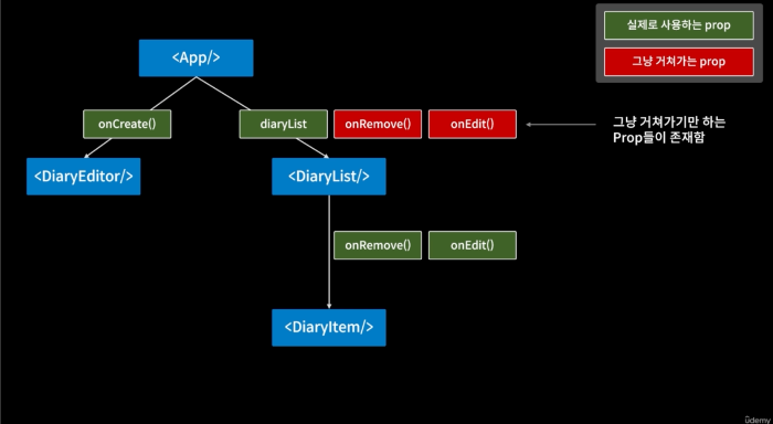 이때 onRemove와 onEdit이 DiaryList를 거쳐서 DiaryItem으로 가야 한다는 것이 문제가 됩니다.